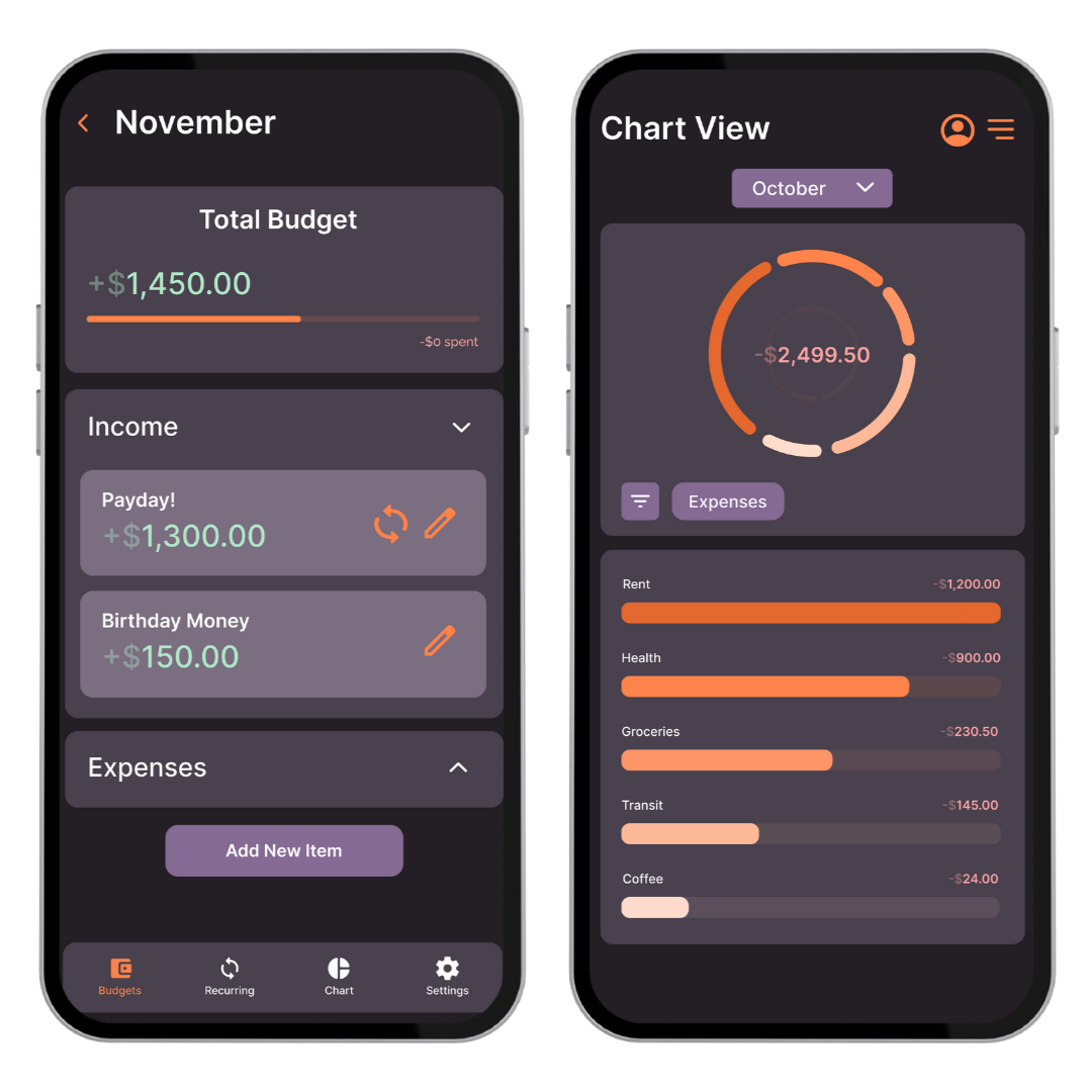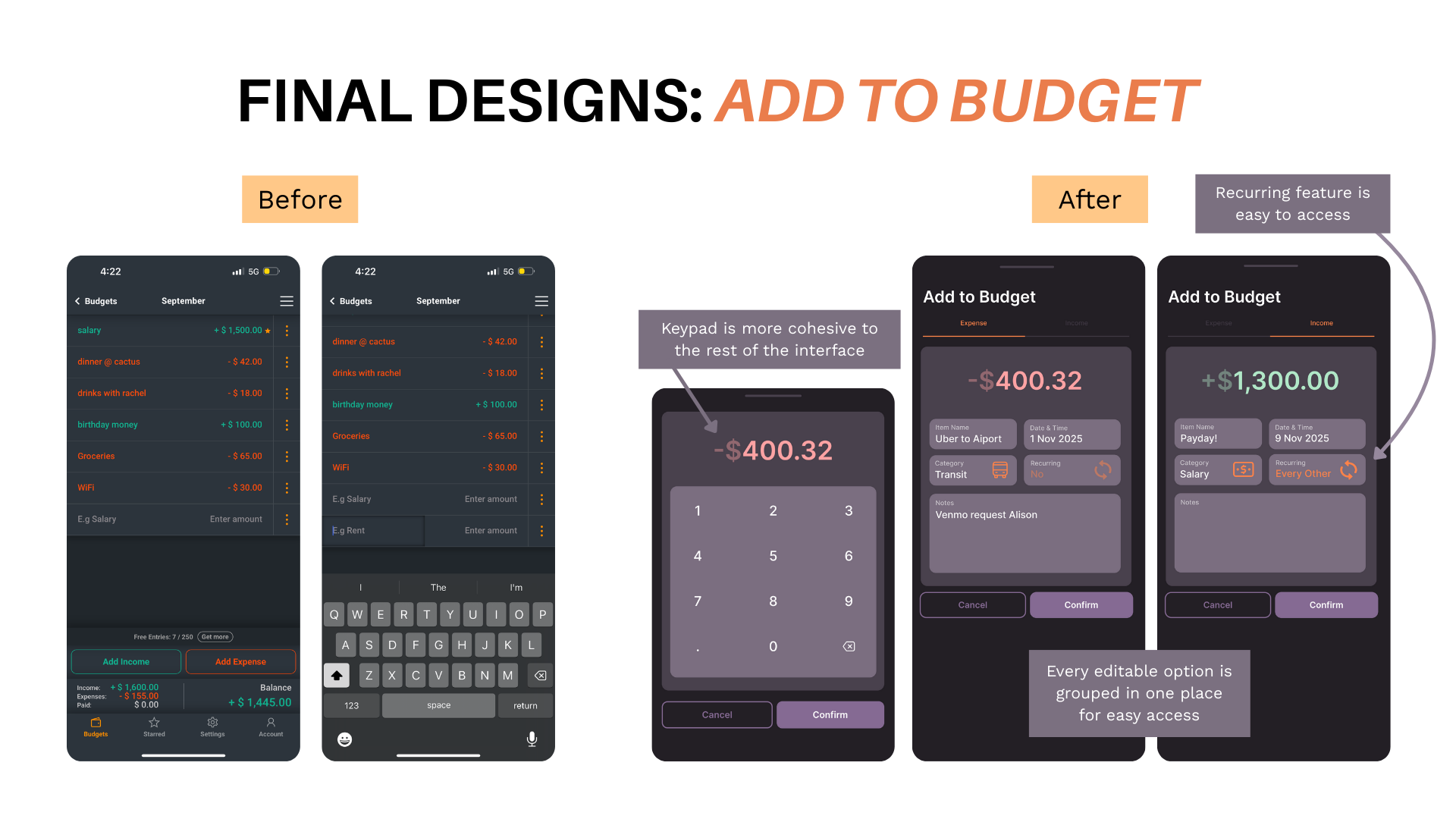 Income and expense values remain red and green to stand out against the purple and support faster recognition when users navigate the “Add to Budget” page.