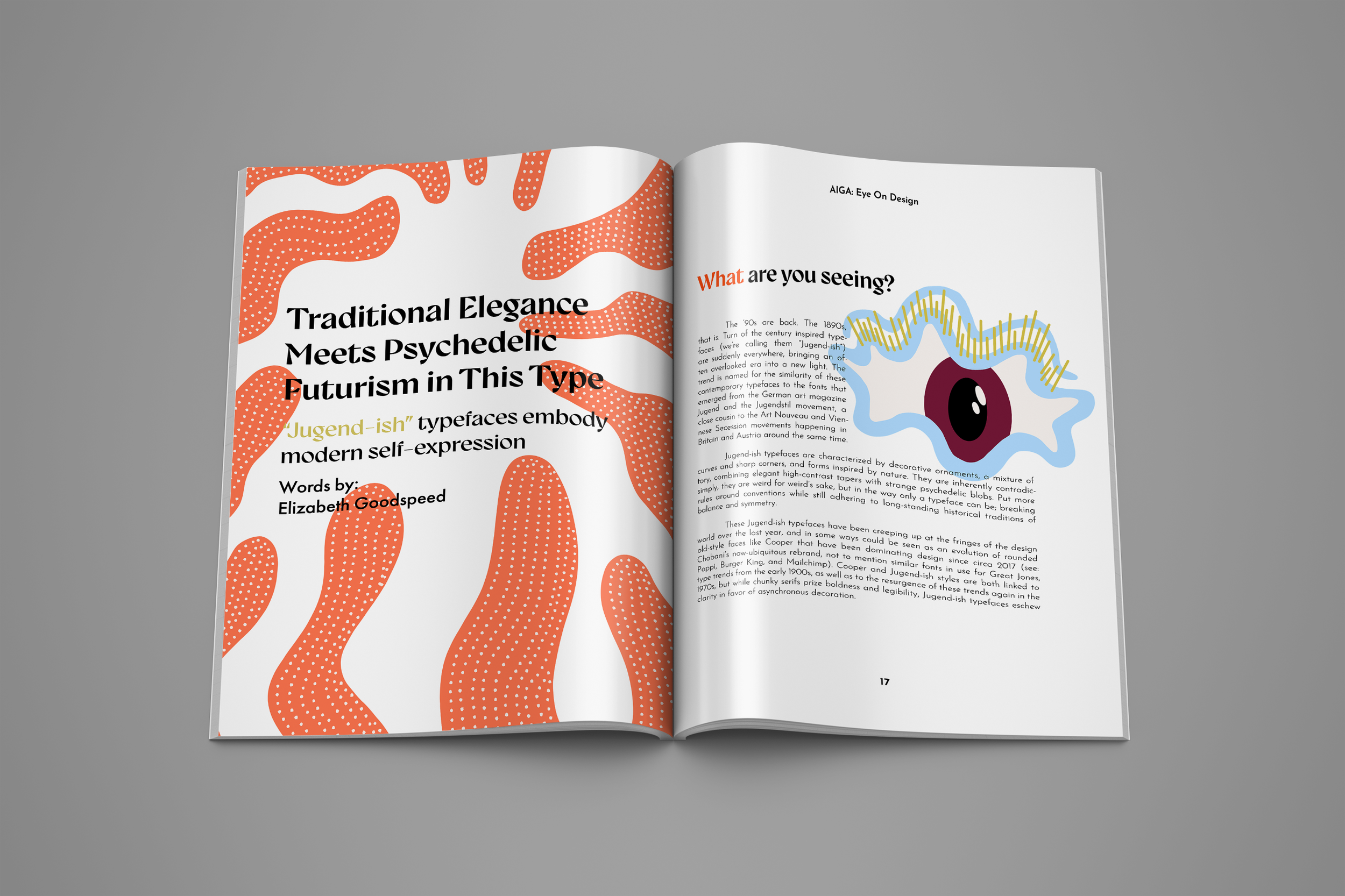 This editorial design project explores the intersection of typography, accessibility, and experimental aesthetics. Drawing inspiration from AIGA Eye on Design articles: “The Inclusive World of Multisensory Typography” and “Traditional Elegance Meets Psychedelic Futurism in This Type,” the magazine reimagines how type can appeal to multiple senses while blending classical structure with bold, modern expression.